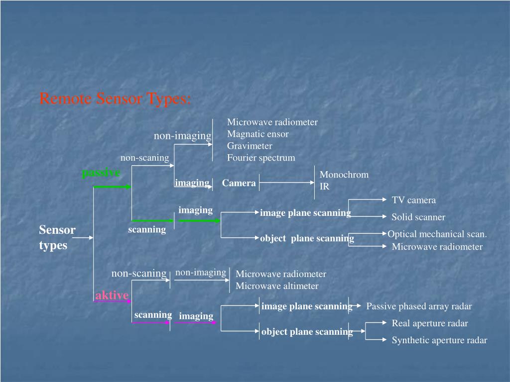 Remote Sensor Types: Microwave radiometer Magnatic ensor Gravimeter Fourier spectrum non-imaging non-scaning passive Monochrom IR imaging Camera TV camera imaging image plane scanning Solid scanner Sensor types scanning Optical mechanical scan. object plane scanning Microwave radiometer non-scaning non-imaging Microwave radiometer Microwave altimeter aktive image plane scanning Passive phased array radar scanning imaging Real aperture radar object plane scanning Synthetic aperture radar