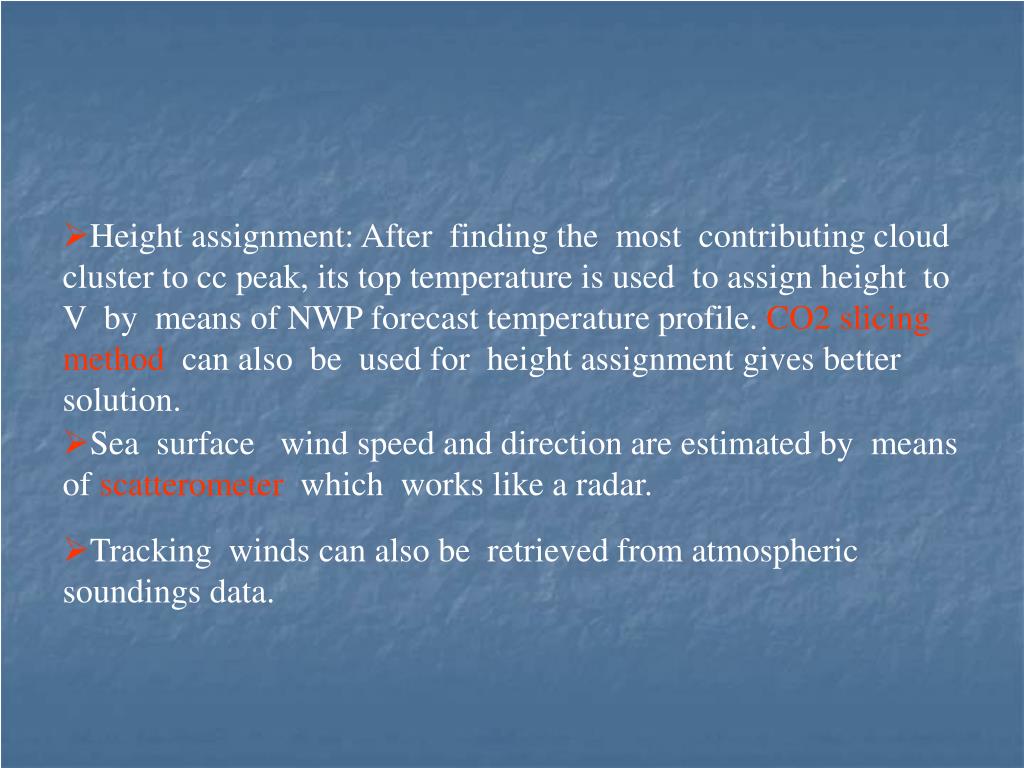 Height assignment: After finding the most contributing cloud cluster to cc peak, its top temperature is used to assign height to V by means of NWP forecast temperature profile. CO2 slicing method can also be used for height assignment gives better solution. • Sea surface wind speed and direction are estimated by means of scatterometer which works like a radar. • Tracking winds can also be retrieved from atmospheric soundings data.