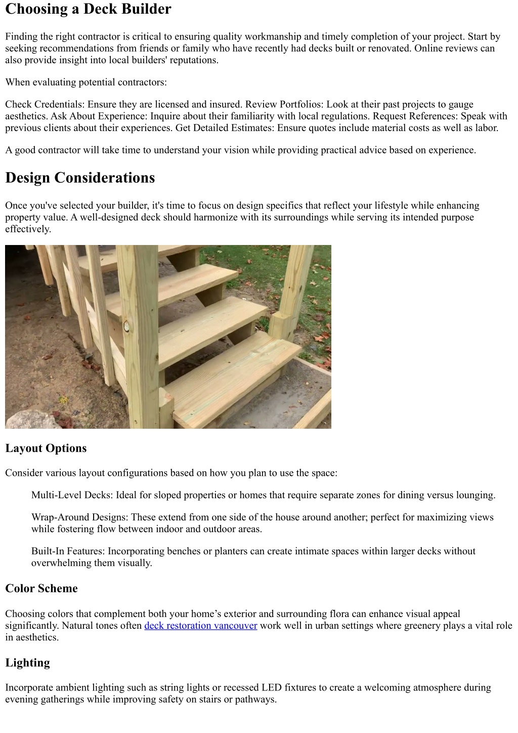 Choosing a Deck Builder Finding the right contractor is critical to ensuring quality workmanship and timely completion of your project. Start by seeking recommendations from friends or family who have recently had decks built or renovated. Online reviews can also provide insight into local builders' reputations. When evaluating potential contractors: Check Credentials: Ensure they are licensed and insured. Review Portfolios: Look at their past projects to gauge aesthetics. Ask About Experience: Inquire about their familiarity with local regulations. Request References: Speak with previous clients about their experiences. Get Detailed Estimates: Ensure quotes include material costs as well as labor. A good contractor will take time to understand your vision while providing practical advice based on experience. Design Considerations Once you've selected your builder, it's time to focus on design specifics that reflect your lifestyle while enhancing property value. A well-designed deck should harmonize with its surroundings while serving its intended purpose effectively. Layout Options Consider various layout configurations based on how you plan to use the space: Multi-Level Decks: Ideal for sloped properties or homes that require separate zones for dining versus lounging. Wrap-Around Designs: These extend from one side of the house around another; perfect for maximizing views while fostering flow between indoor and outdoor areas. Built-In Features: Incorporating benches or planters can create intimate spaces within larger decks without overwhelming them visually. Color Scheme Choosing colors that complement both your home’s exterior and surrounding flora can enhance visual appeal significantly. Natural tones often deck restoration vancouver work well in urban settings where greenery plays a vital role in aesthetics. Lighting Incorporate ambient lighting such as string lights or recessed LED fixtures to create a welcoming atmosphere during evening gatherings while improving safety on stairs or pathways.