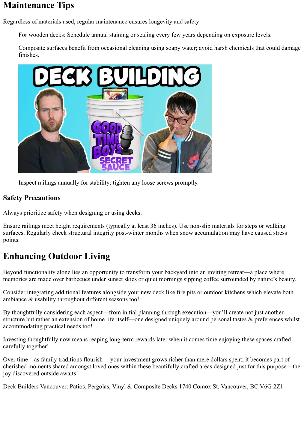 Maintenance Tips Regardless of materials used, regular maintenance ensures longevity and safety: For wooden decks: Schedule annual staining or sealing every few years depending on exposure levels. Composite surfaces benefit from occasional cleaning using soapy water; avoid harsh chemicals that could damage finishes. Inspect railings annually for stability; tighten any loose screws promptly. Safety Precautions Always prioritize safety when designing or using decks: Ensure railings meet height requirements (typically at least 36 inches). Use non-slip materials for steps or walking surfaces. Regularly check structural integrity post-winter months when snow accumulation may have caused stress points. Enhancing Outdoor Living Beyond functionality alone lies an opportunity to transform your backyard into an inviting retreat—a place where memories are made over barbecues under sunset skies or quiet mornings sipping coffee surrounded by nature’s beauty. Consider integrating additional features alongside your new deck like fire pits or outdoor kitchens which elevate both ambiance & usability throughout different seasons too! By thoughtfully considering each aspect—from initial planning through execution—you’ll create not just another structure but rather an extension of home life itself—one designed uniquely around personal tastes & preferences whilst accommodating practical needs too! Investing thoughtfully now means reaping long-term rewards later when it comes time enjoying these spaces crafted carefully together! Over time—as family traditions flourish —your investment grows richer than mere dollars spent; it becomes part of cherished moments shared amongst loved ones within these beautifully crafted areas designed just for this purpose—the joy discovered outside awaits! Deck Builders Vancouver: Patios, Pergolas, Vinyl & Composite Decks 1740 Comox St, Vancouver, BC V6G 2Z1