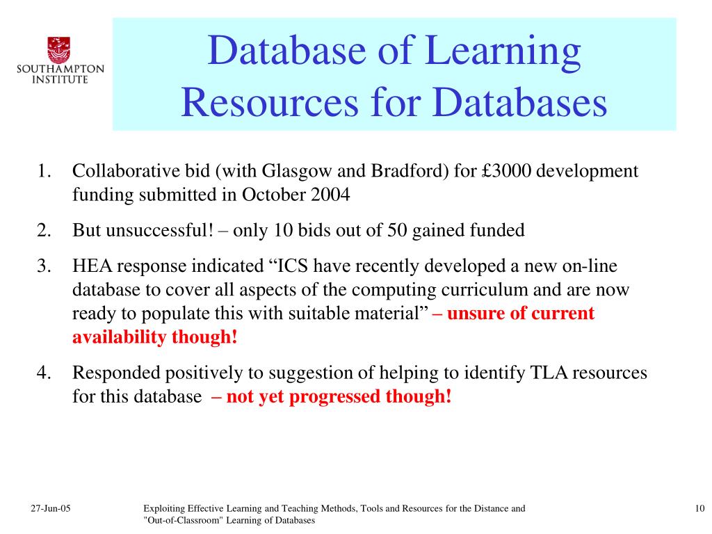 Database of Learning Resources for Databases • Collaborative bid (with Glasgow and Bradford) for £3000 development funding submitted in October 2004 • But unsuccessful! – only 10 bids out of 50 gained funded • HEA response indicated “ICS have recently developed a new on-line database to cover all aspects of the computing curriculum and are now ready to populate this with suitable material” – unsure of current availability though! • Responded positively to suggestion of helping to identify TLA resources for this database –not yet progressed though! Exploiting Effective Learning and Teaching Methods, Tools and Resources for the Distance and "Out-of-Classroom" Learning of Databases