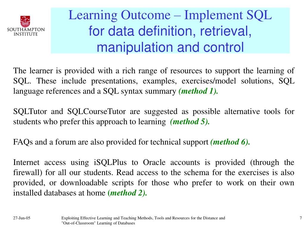 Learning Outcome – Implement SQLfor data definition, retrieval, manipulation and control The learner is provided with a rich range of resources to support the learning of SQL. These include presentations, examples, exercises/model solutions, SQL language references and a SQL syntax summary (method 1). SQLTutor and SQLCourseTutor are suggested as possible alternative tools for students who prefer this approach to learning (method 5). FAQs and a forum are also provided for technical support (method 6). Internet access using iSQLPlus to Oracle accounts is provided (through the firewall) for all our students. Read access to the schema for the exercises is also provided, or downloadable scripts for those who prefer to work on their own installed databases at home (method 2). Exploiting Effective Learning and Teaching Methods, Tools and Resources for the Distance and "Out-of-Classroom" Learning of Databases
