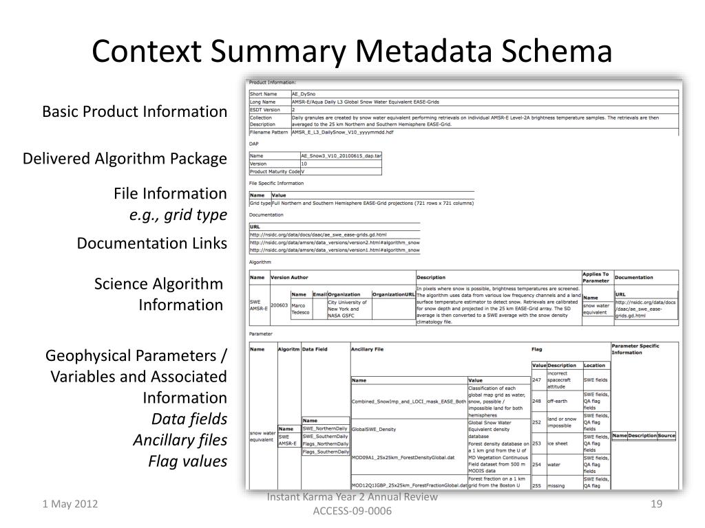 Context Summary Metadata Schema Basic Product Information Delivered Algorithm Package File Information e.g., grid type Documentation Links Science Algorithm Information Geophysical Parameters / Variables and Associated Information Data fields Ancillary files Flag values Instant Karma Year 2 Annual Review ACCESS-09-0006