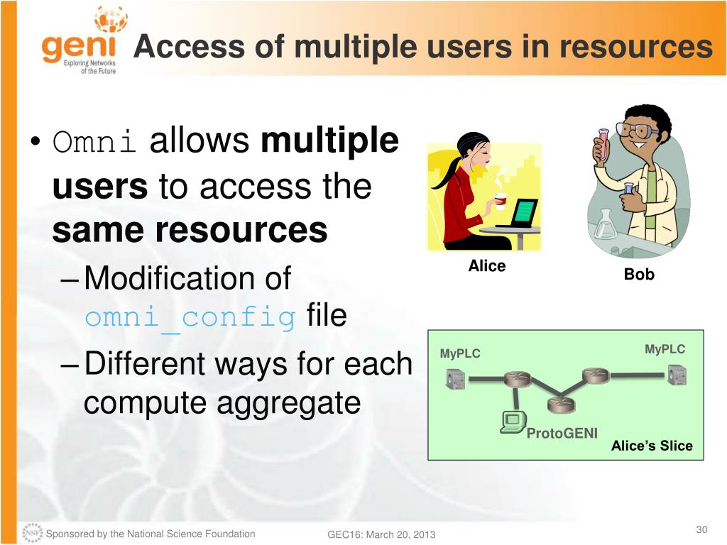 Access of multiple users in resources • Omni allows multiple users to access the same resources • Modification of omni_config file • Different ways for each compute aggregate ProtoGENI Bob Alice Alice’s Slice MyPLC MyPLC