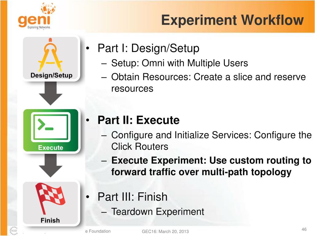 Part I: Design/Setup • Setup: Omni with Multiple Users • Obtain Resources: Create a slice and reserve resources • Part II: Execute • Configure and Initialize Services: Configure the Click Routers • Execute Experiment: Use custom routing to forward traffic over multi-path topology • Part III: Finish • Teardown Experiment