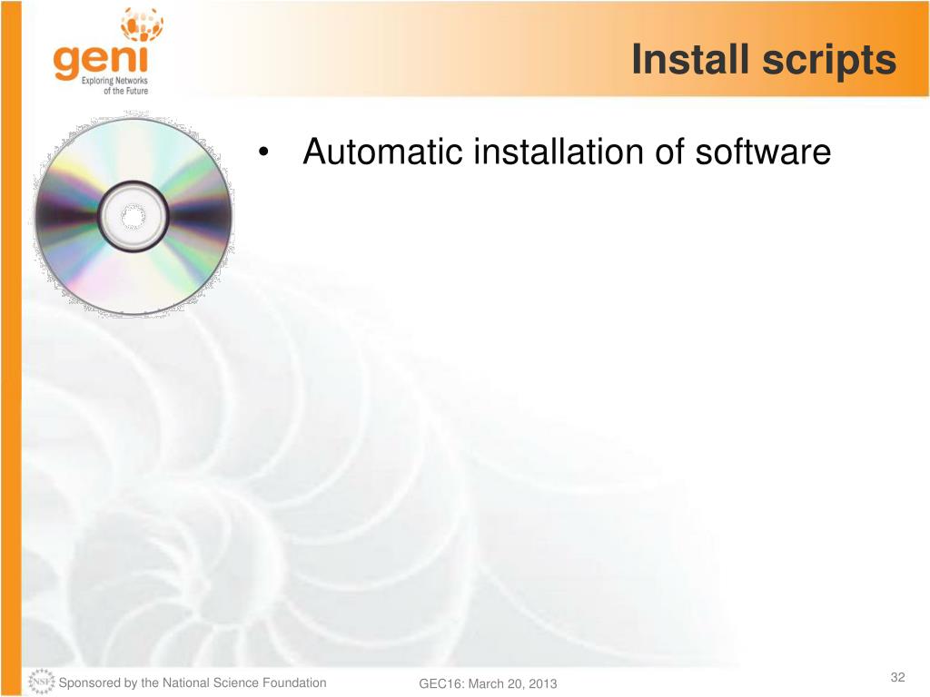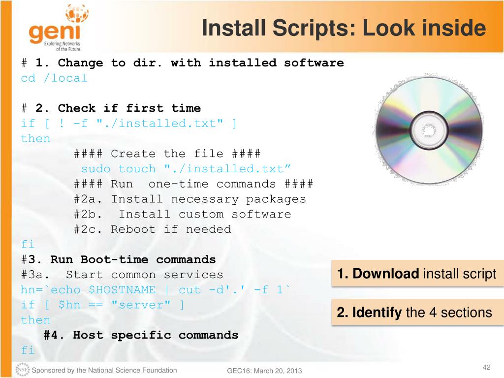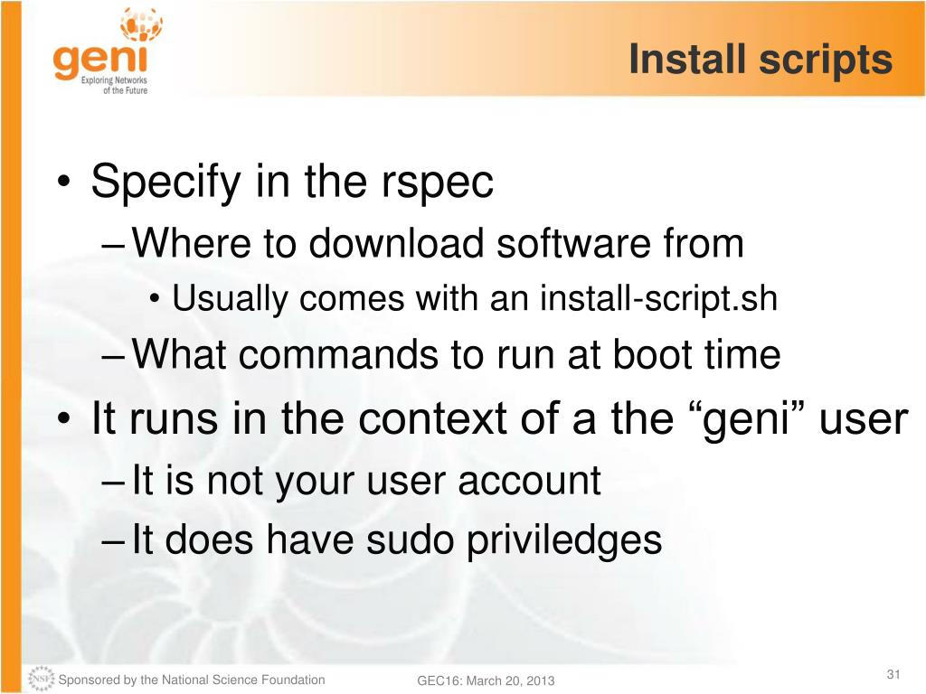 Install scripts • Specify in the rspec • Where to download software from • Usually comes with an install-script.sh • What commands to run at boot time • It runs in the context of a the “geni” user • It is not your user account • It does have sudopriviledges