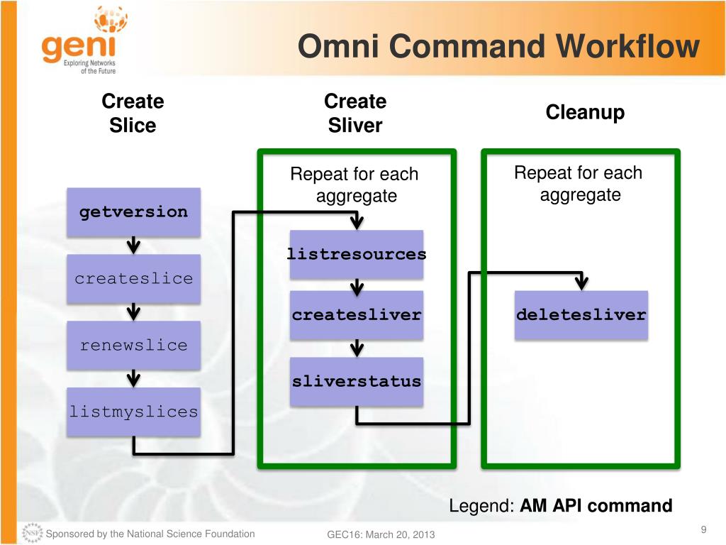 Omni Command Workflow Create Slice Create Sliver Cleanup Repeat for each aggregate Repeat for each aggregate listresources listmyslices createsliver sliverstatus deletesliver createslice getversion renewslice Legend: AM API command