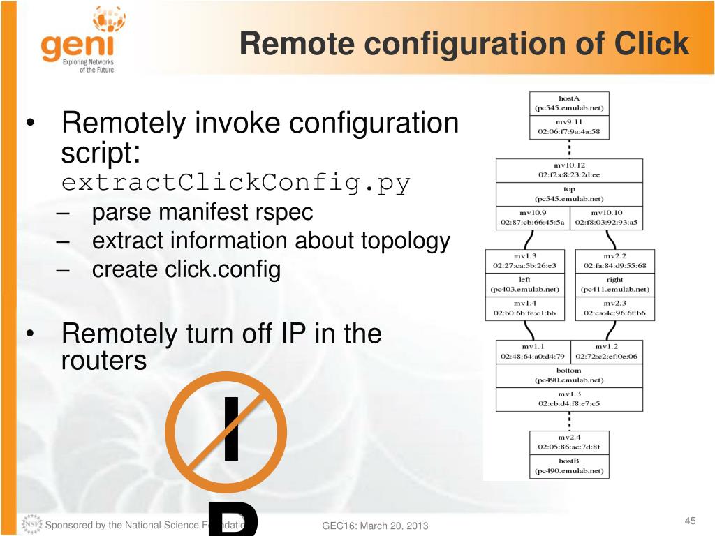 Remote configuration of Click • Remotely invoke configuration script: extractClickConfig.py • parse manifest rspec • extract information about topology • create click.config • Remotely turn off IP in the routers IP