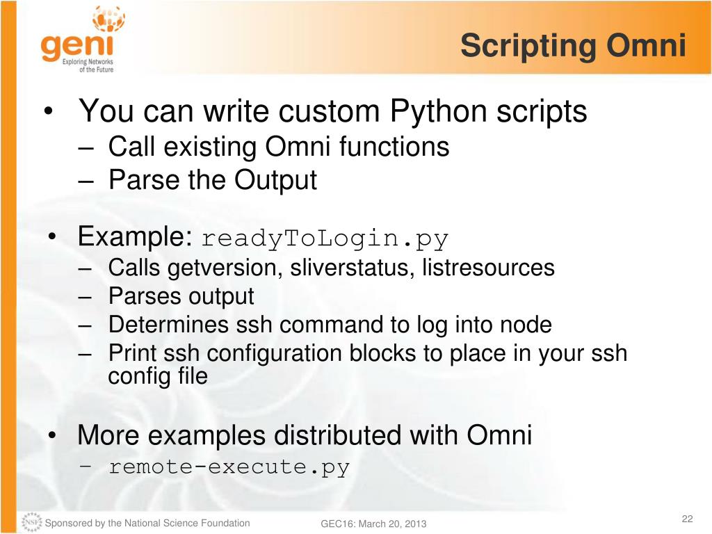 Scripting Omni • You can write custom Python scripts • Call existing Omni functions • Parse the Output • Example: readyToLogin.py • Calls getversion, sliverstatus, listresources • Parses output • Determines ssh command to log into node • Print ssh configuration blocks to place in your sshconfig file • More examples distributed with Omni • remote-execute.py