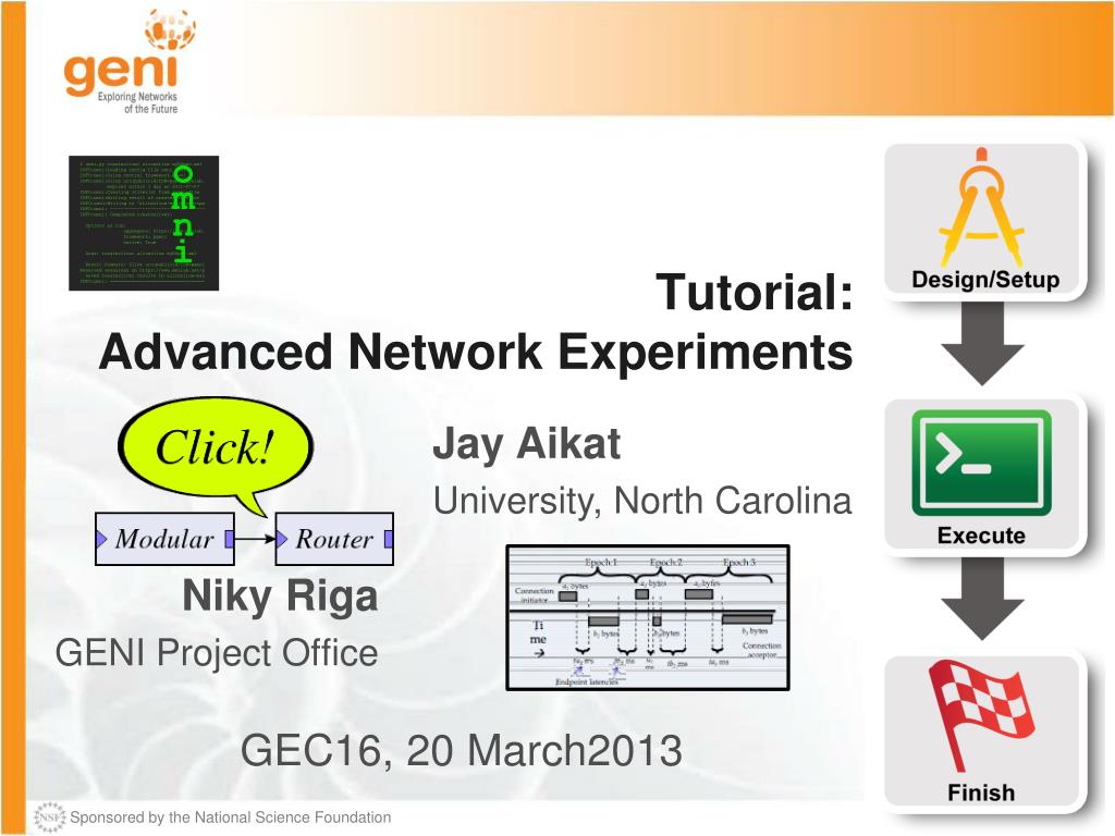 Tutorial: Advanced Network Experiments $ omni.pycreatesliveraliceslicemyRSpec.xml INFO:omni:Loadingconfig file omni_config INFO:omni:Using control framework pgeni INFO:omni:Sliceurn:publicid:IDN+pgeni.gpolab. expires within 1 day on 2011-07-07 INFO:omni:Creating sliver(s) from rspec file INFO:omni:Writing result of createsliver for INFO:omni:Writing to ‘aliceslice-manifest-rspe INFO:omni: ----------------------------------- INFO:omni: Completed createsliver: Options as run: aggregate: https://www.emulab. framework: pgeni native: True Args: createsliveraliceslicemyRSpec.xml Result Summary: Slice urn:publicid:IDN+pgeni Reserved resources on https://www.emulab.net/p Saved createsliver results to aliceslice-man INFO:omni: =================================== o m n i Jay Aikat University, North Carolina Niky Riga GENI Project Office GEC16, 20 March2013