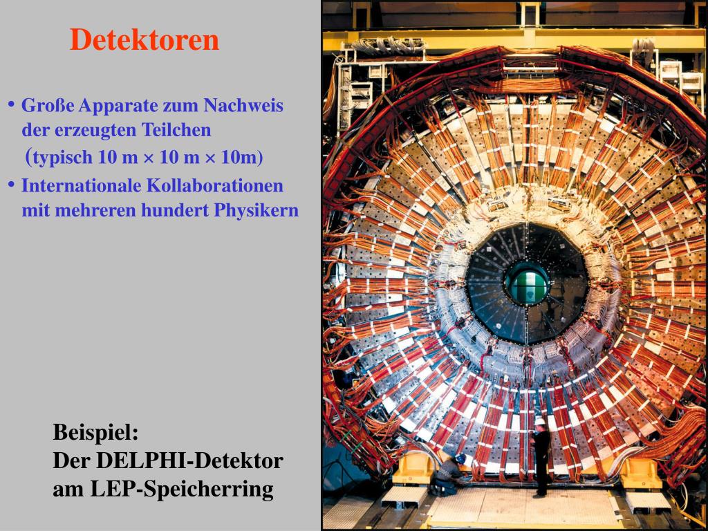 Detektoren • Große Apparate zum Nachweis • der erzeugten Teilchen • (typisch 10 m 10 m 10m) • Internationale Kollaborationen • mit mehreren hundert Physikern Beispiel: Der DELPHI-Detektor am LEP-Speicherring