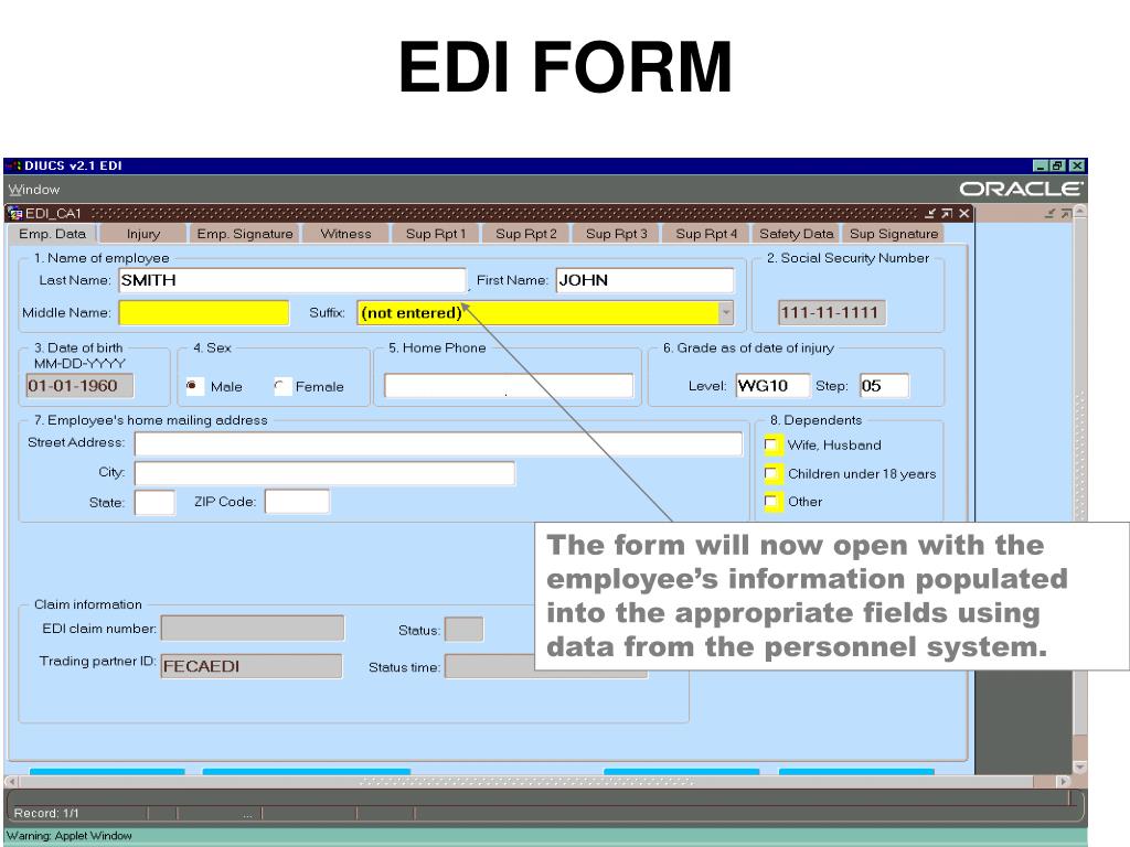 SUMMARY OFSUPERVISOR ACTIONS • Supervisor accesses the EDI application through the “Filing Claims Electronically” link on the ICUC Web page. • Supervisor enters the SSN and Date of Birth of the employee and selects whether a CA-1 or CA-2 will be filed • Employee information is entered onto the form • Witness information is entered (if applicable)