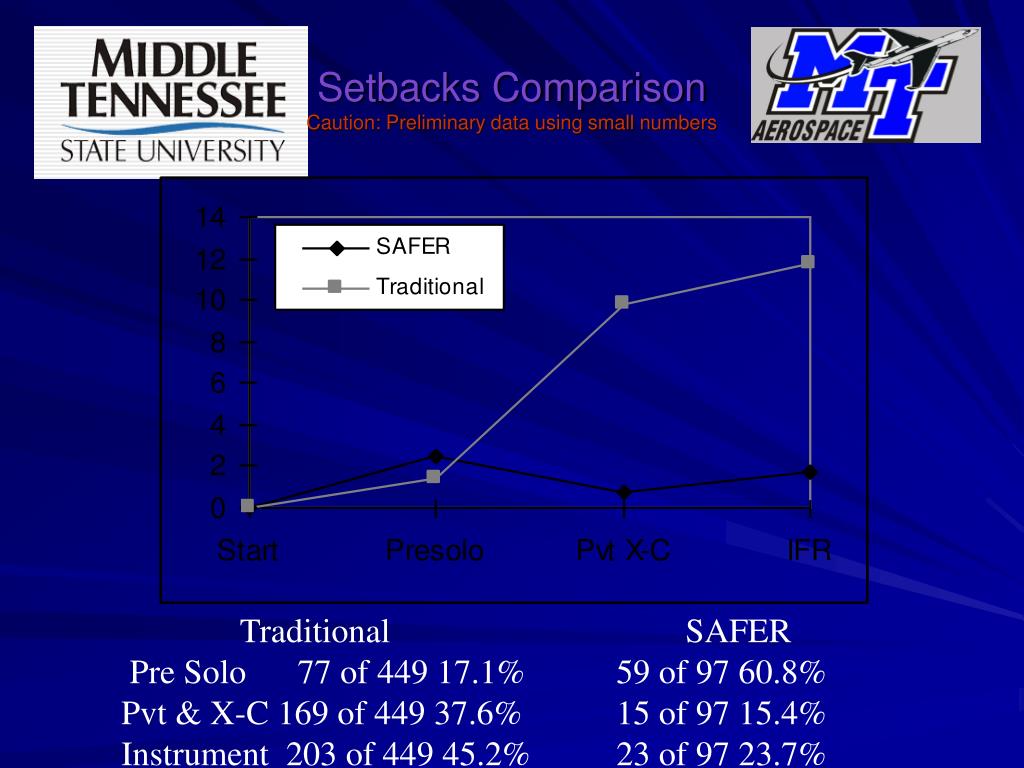 Setbacks ComparisonCaution: Preliminary data using small numbers Traditional SAFER Pre Solo 77 of 449 17.1% 59 of 97 60.8% Pvt & X-C 169 of 449 37.6% 15 of 97 15.4% Instrument 203 of 449 45.2% 23 of 97 23.7%