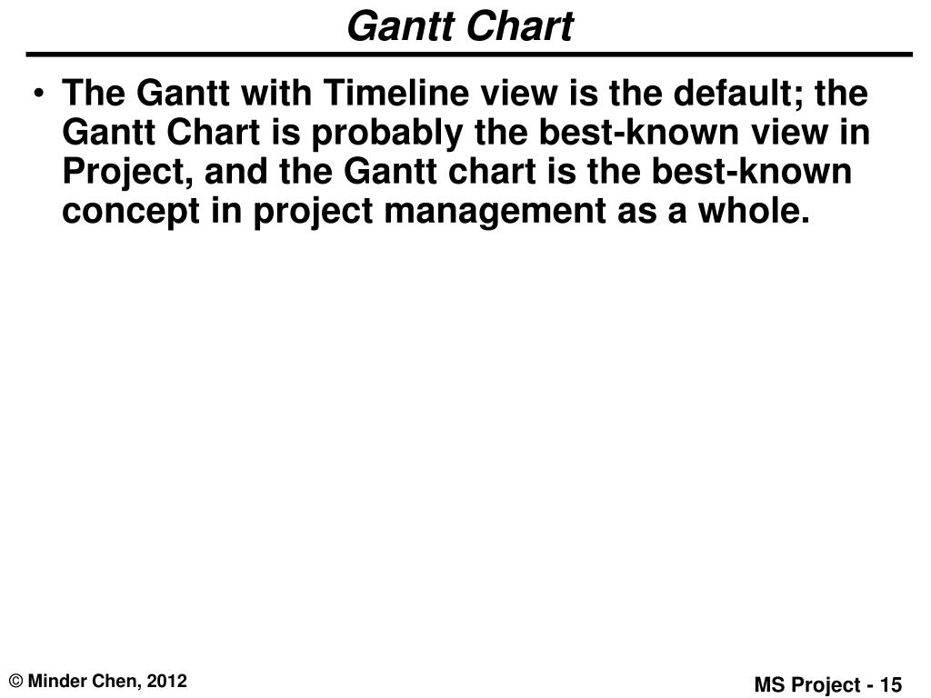 Gantt Chart • The Gantt with Timeline view is the default; the Gantt Chart is probably the best-known view in Project, and the Gantt chart is the best-known concept in project management as a whole.