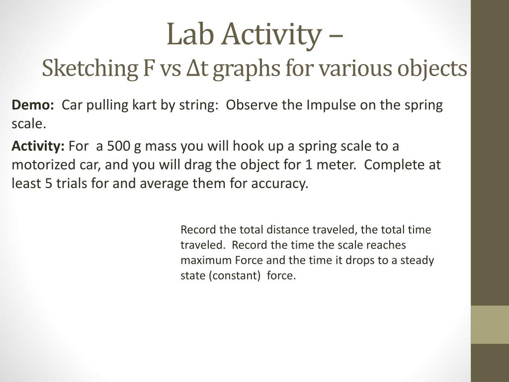 Lab Activity – Sketching F vsΔt graphs for various objects Demo: Car pulling kart by string: Observe the Impulse on the spring scale. Activity: For a 500 g mass you will hook up a spring scale to a motorized car, and you will drag the object for 1 meter. Complete at least 5 trials for and average them for accuracy. Record the total distance traveled, the total time traveled. Record the time the scale reaches maximum Force and the time it drops to a steady state (constant) force.