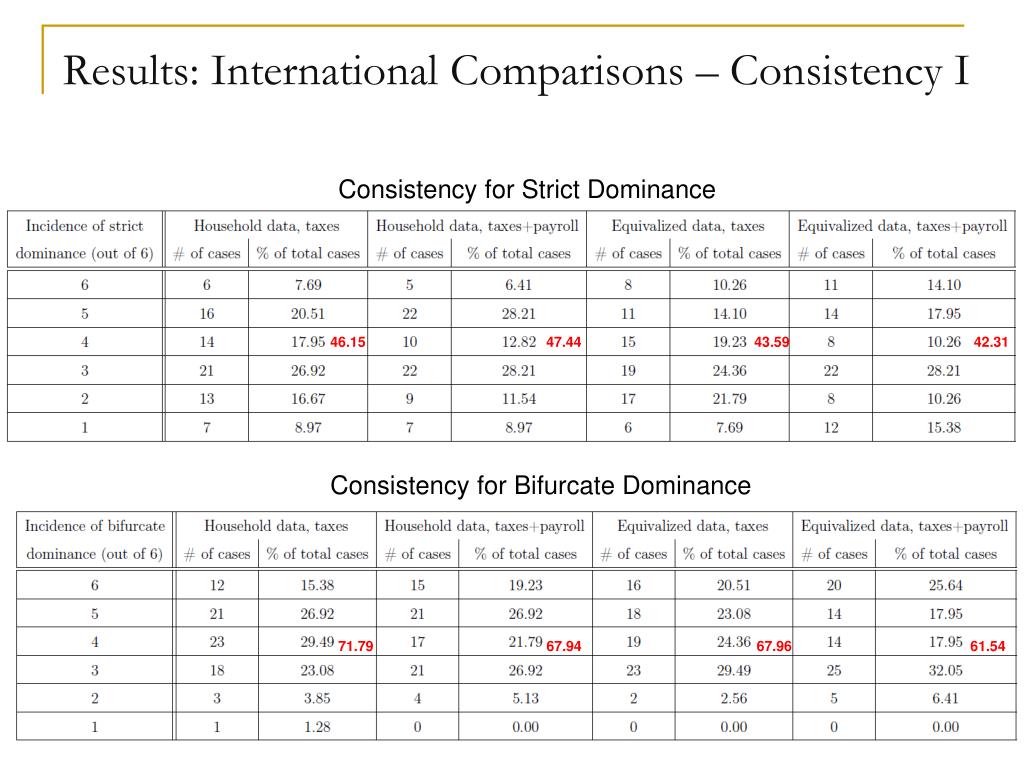 Results: International Comparisons – Consistency I Consistency for Strict Dominance 46.15 47.44 43.59 42.31 Consistency for Bifurcate Dominance 71.79 67.94 67.96 61.54