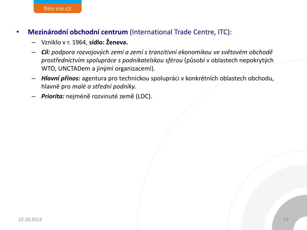 Mezinárodní obchodní centrum (International Trade Centre, ITC): • Vzniklo v r. 1964, sídlo: Ženeva. • Cíl: podpora rozvojových zemí a zemí s tranzitivní ekonomikou ve světovém obchodě prostřednictvím spolupráce s podnikatelskou sférou (působí v oblastech nepokrytýchWTO, UNCTADem a jinými organizacemi). • Hlavní přínos:agentura pro technickou spolupráci v konkrétních oblastech obchodu, hlavně pro malé a střední podniky. • Priorita: nejméně rozvinuté země (LDC).