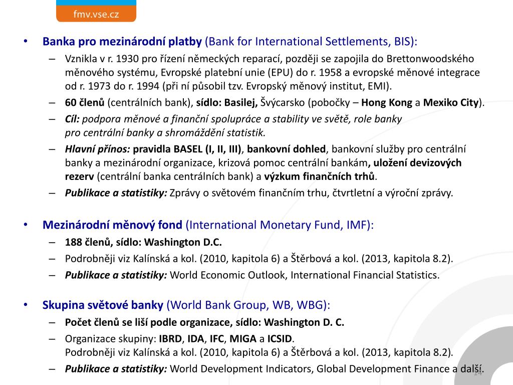 Banka pro mezinárodní platby (Bank for International Settlements, BIS): • Vznikla v r. 1930 pro řízení německých reparací, později se zapojila do Brettonwoodského měnového systému, Evropské platební unie (EPU) do r. 1958 a evropské měnové integrace od r. 1973 do r. 1994 (při ní působil tzv. Evropský měnový institut, EMI). • 60 členů (centrálních bank),sídlo: Basilej, Švýcarsko(pobočky – Hong Kong a Mexiko City). • Cíl: podpora měnové a finanční spolupráce a stability ve světě, role bankypro centrální banky a shromáždění statistik. • Hlavní přínos:pravidla BASEL (I, II, III), bankovní dohled, bankovní služby pro centrální banky a mezinárodní organizace, krizová pomoc centrální bankám, uložení devizových rezerv (centrální banka centrálních bank) a výzkum finančních trhů. • Publikace a statistiky: Zprávy o světovém finančním trhu, čtvrtletní a výroční zprávy. • Mezinárodní měnový fond (International MonetaryFund, IMF): • 188 členů, sídlo: Washington D.C. • Podrobněji viz Kalínská a kol. (2010, kapitola 6)a Štěrbová a kol. (2013, kapitola 8.2). • Publikace a statistiky:WorldEconomic Outlook, International FinancialStatistics. • Skupina světové banky (World Bank Group, WB, WBG): • Počet členů se liší podle organizace, sídlo: Washington D. C. • Organizace skupiny: IBRD, IDA, IFC, MIGA a ICSID.Podrobněji viz Kalínská a kol. (2010, kapitola 6) a Štěrbová a kol. (2013, kapitola 8.2). • Publikace a statistiky:WorldDevelopmentIndicators, GlobalDevelopment Finance a další.