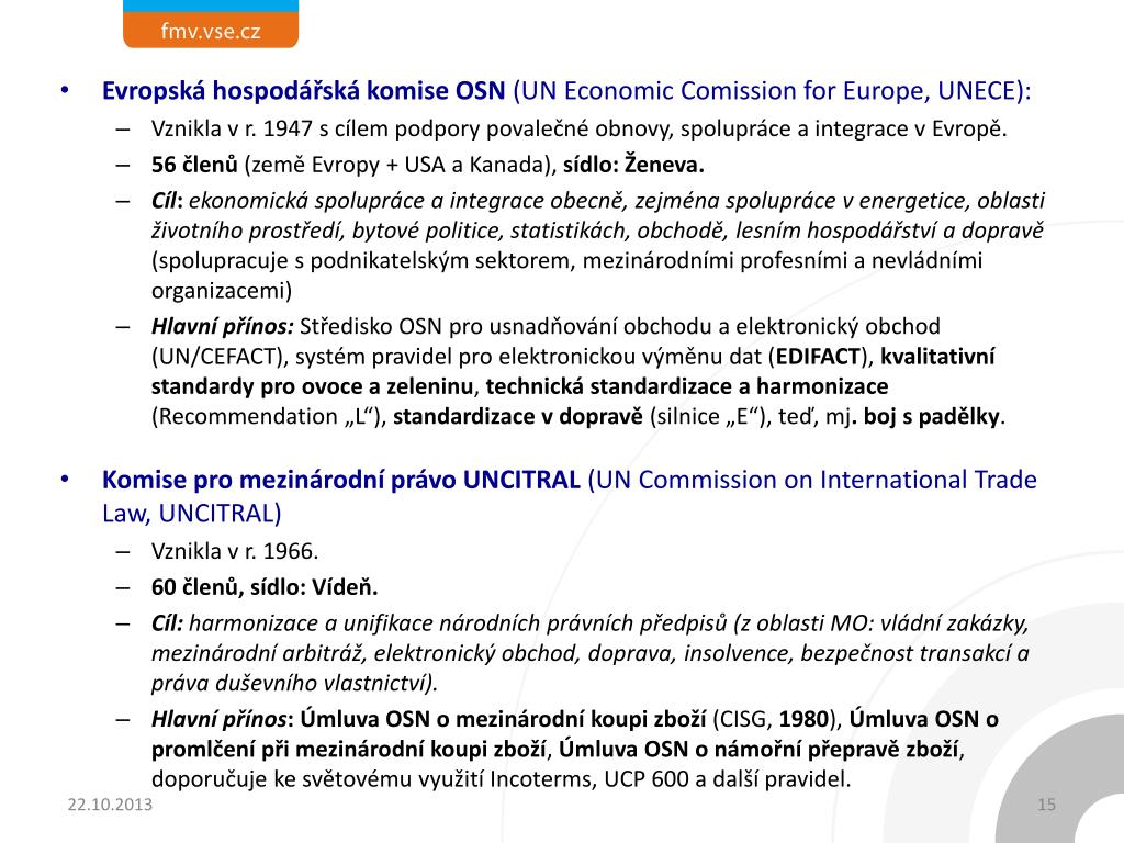 Evropská hospodářská komise OSN (UN EconomicComissionforEurope, UNECE): • Vznikla v r. 1947 s cílem podpory povalečné obnovy, spolupráce a integrace v Evropě. • 56 členů (země Evropy + USA a Kanada), sídlo: Ženeva. • Cíl:ekonomická spolupráce a integrace obecně, zejména spolupráce v energetice, oblasti životního prostředí, bytové politice, statistikách, obchodě, lesním hospodářství a dopravě (spolupracuje s podnikatelským sektorem, mezinárodními profesními a nevládními organizacemi) • Hlavní přínos: Středisko OSN pro usnadňování obchodu a elektronický obchod (UN/CEFACT), systém pravidel pro elektronickou výměnu dat (EDIFACT), kvalitativní standardy pro ovoce a zeleninu, technická standardizace a harmonizace (Recommendation „L“), standardizace v dopravě (silnice „E“), teď, mj. boj s padělky. • Komise pro mezinárodní právo UNCITRAL (UN Commission on International TradeLaw, UNCITRAL) • Vznikla v r. 1966. • 60 členů, sídlo: Vídeň. • Cíl: harmonizace a unifikace národních právních předpisů (z oblasti MO: vládní zakázky, mezinárodní arbitráž, elektronický obchod, doprava, insolvence, bezpečnost transakcí a práva duševního vlastnictví). • Hlavní přínos: Úmluva OSN o mezinárodní koupi zboží (CISG, 1980), Úmluva OSN o promlčení při mezinárodní koupi zboží, Úmluva OSN o námořní přepravě zboží, doporučuje ke světovému využití Incoterms, UCP 600 a další pravidel.