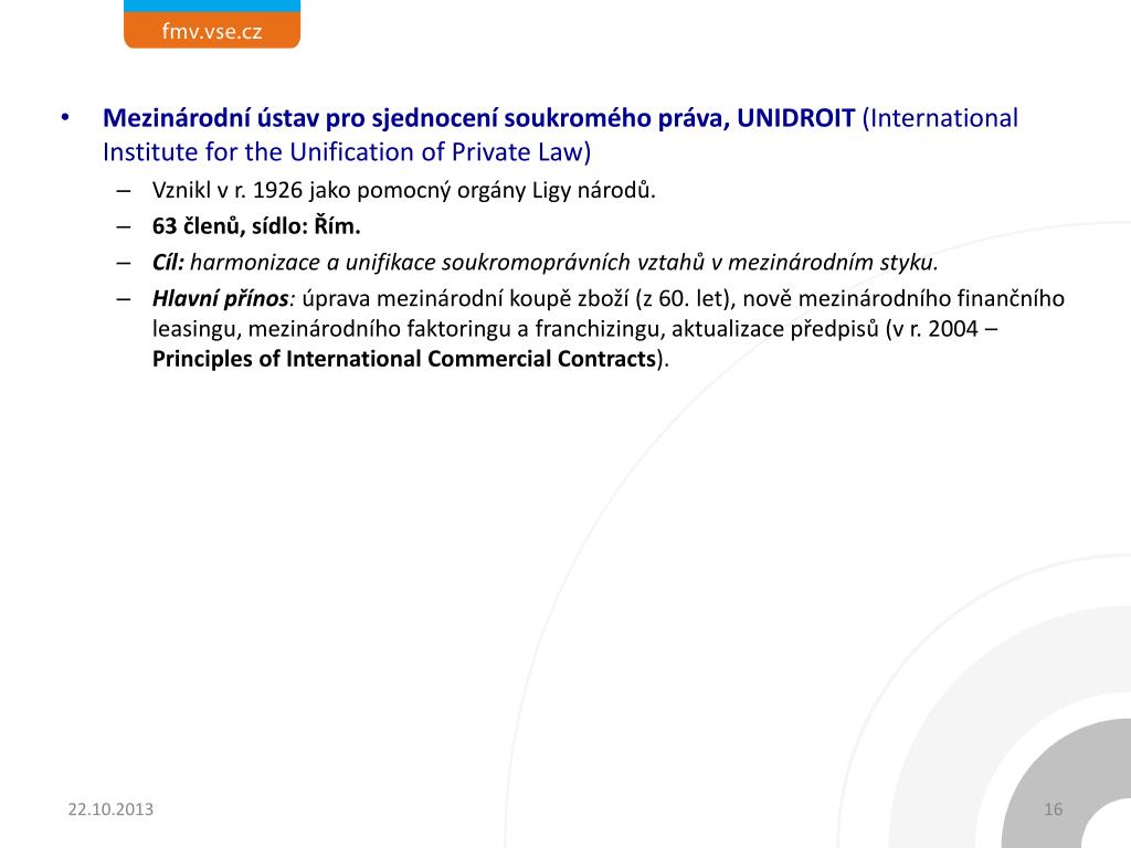 Mezinárodní ústav pro sjednocení soukromého práva, UNIDROIT (International Institute fortheUnificationofPrivateLaw) • Vznikl v r. 1926 jako pomocný orgány Ligy národů. • 63 členů, sídlo: Řím. • Cíl: harmonizace a unifikace soukromoprávních vztahů v mezinárodním styku. • Hlavní přínos: úprava mezinárodní koupě zboží (z 60. let), nově mezinárodního finančního leasingu, mezinárodního faktoringu a franchizingu, aktualizace předpisů (v r. 2004 –Principlesof International CommercialContracts).