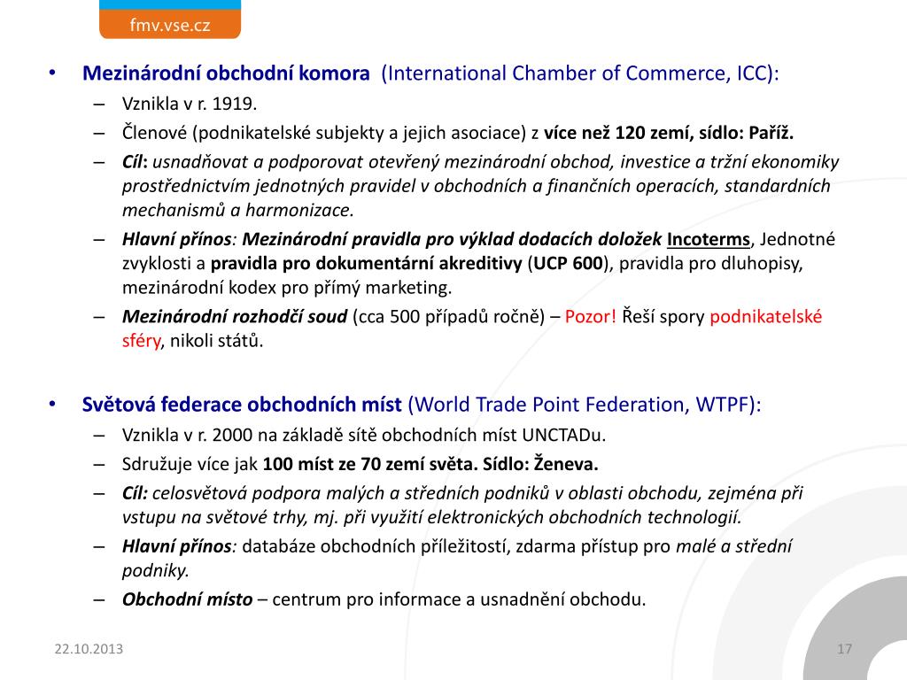 Mezinárodní obchodní komora (International ChamberofCommerce, ICC): • Vznikla v r. 1919. • Členové (podnikatelské subjekty a jejich asociace) z více než 120 zemí, sídlo: Paříž. • Cíl: usnadňovat a podporovat otevřený mezinárodní obchod, investice a tržní ekonomiky prostřednictvím jednotných pravidel v obchodních a finančních operacích, standardních mechanismů a harmonizace. • Hlavní přínos: Mezinárodní pravidla pro výklad dodacích doložek Incoterms, Jednotné zvyklosti a pravidla pro dokumentární akreditivy (UCP 600), pravidla pro dluhopisy, mezinárodní kodex pro přímý marketing. • Mezinárodní rozhodčí soud(cca 500 případů ročně) – Pozor!Řeší spory podnikatelské sféry, nikoli států. • Světová federace obchodních míst (WorldTrade Point Federation, WTPF): • Vznikla v r. 2000 na základě sítě obchodních míst UNCTADu. • Sdružuje více jak 100 míst ze 70 zemí světa. Sídlo: Ženeva. • Cíl:celosvětová podpora malých a středních podniků v oblasti obchodu, zejména při vstupu na světové trhy, mj. při využití elektronických obchodních technologií. • Hlavní přínos: databáze obchodních příležitostí, zdarma přístup pro malé a střední podniky. • Obchodní místo– centrum pro informace a usnadnění obchodu.