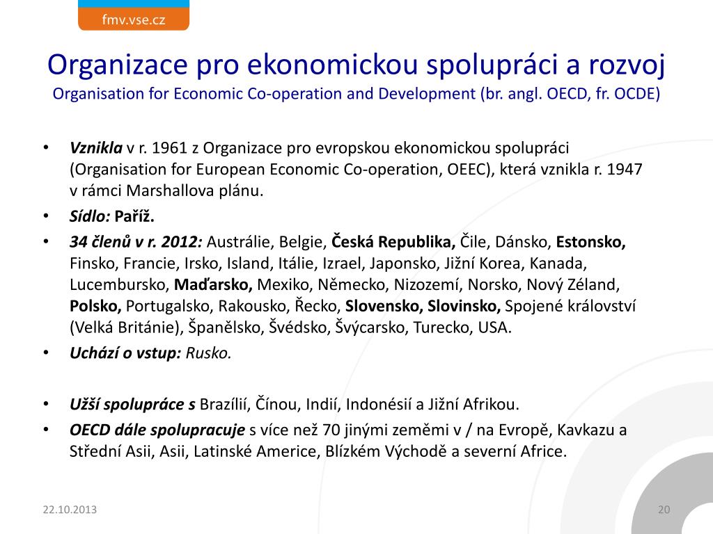 Organizace pro ekonomickou spolupráci a rozvojOrganisationforEconomic Co-operationandDevelopment (br. angl. OECD, fr. OCDE) • Vznikla v r. 1961 z Organizace pro evropskou ekonomickou spolupráci (OrganisationforEuropeanEconomic Co-operation, OEEC), která vznikla r. 1947v rámci Marshallova plánu. • Sídlo: Paříž. • 34 členů v r. 2012:Austrálie, Belgie, Česká Republika, Čile, Dánsko, Estonsko, Finsko, Francie, Irsko, Island, Itálie, Izrael, Japonsko, Jižní Korea, Kanada, Lucembursko, Maďarsko, Mexiko, Německo, Nizozemí, Norsko, Nový Zéland, Polsko, Portugalsko, Rakousko, Řecko, Slovensko, Slovinsko, Spojené království (Velká Británie), Španělsko, Švédsko, Švýcarsko, Turecko, USA. • Uchází o vstup:Rusko. • Užší spolupráce sBrazílií, Čínou, Indií, Indonésií a Jižní Afrikou. • OECD dále spolupracujes více než 70 jinými zeměmi v / na Evropě, Kavkazu a Střední Asii, Asii, Latinské Americe, Blízkém Východě a severní Africe.