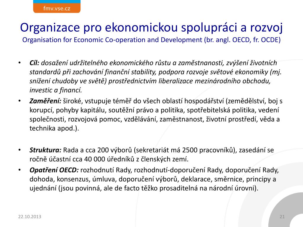 Organizace pro ekonomickou spolupráci a rozvojOrganisation for Economic Co-operation and Development (br. angl. OECD, fr. OCDE) • Hlavní přínos:Konsenzus OECD(konsenzus k oficiálně podporovaným exportním úvěrům) z r. 2005 *, doporučení společného postupu v oblasti životního prostředí a oficiálně podporovaných exportních úvěrů z r. 2007, zprostředkování jednání, technická pomoc vládám a statistická činnost, mj. studie zaměřené na konkrétní členské a nečlenské země. • Publikace: OECD Economic Outlook, OECD Factbook, OECD Economic Surveys a Going for Growth. * Konsenzus OECD upravuje exportní financování ve členských zemích, je gentlemanskou (nezávaznou) dohodou pro země OECD, v EU je však povinný na základě práva EU (Acquiscommunautaire).