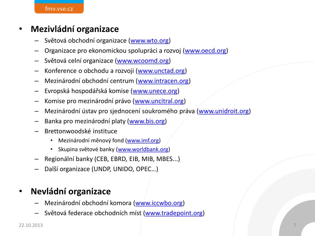 Mezivládní organizace • Světová obchodní organizace (www.wto.org) • Organizace pro ekonomickou spolupráci a rozvoj (www.oecd.org) • Světová celní organizace (www.wcoomd.org) • Konference o obchodu a rozvoji (www.unctad.org) • Mezinárodní obchodní centrum (www.intracen.org) • Evropská hospodářská komise (www.unece.org) • Komise pro mezinárodní právo (www.uncitral.org) • Mezinárodní ústav pro sjednocení soukromého práva (www.unidroit.org) • Banka pro mezinárodní platy (www.bis.org) • Brettonwoodské instituce • Mezinárodní měnový fond (www.imf.org) • Skupina světové banky (www.worldbank.org) • Regionální banky (CEB, EBRD, EIB, MIB, MBES...) • Další organizace (UNDP, UNIDO, OPEC…) • Nevládní organizace • Mezinárodní obchodní komora (www.iccwbo.org) • Světová federace obchodních míst (www.tradepoint.org)