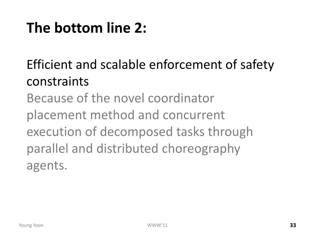 The bottom line 2: Efficient and scalable enforcement of safety constraintsBecause of the novel coordinator placement method and concurrent execution of decomposed tasks through parallel and distributed choreography agents. WWW'11