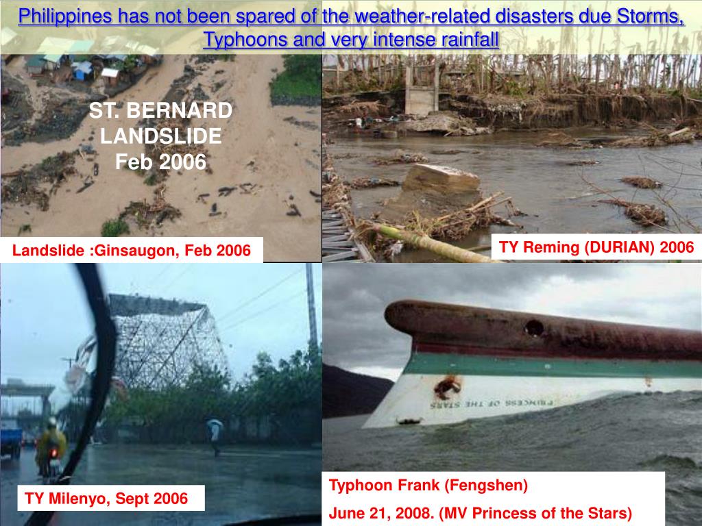 Philippines has not been spared of the weather-related disasters due Storms, Typhoons and very intense rainfall ST. BERNARD LANDSLIDE Feb 2006 TY Reming (DURIAN) 2006 Landslide :Ginsaugon, Feb 2006 Typhoon Frank (Fengshen) June 21, 2008. (MV Princess of the Stars) TY Milenyo, Sept 2006