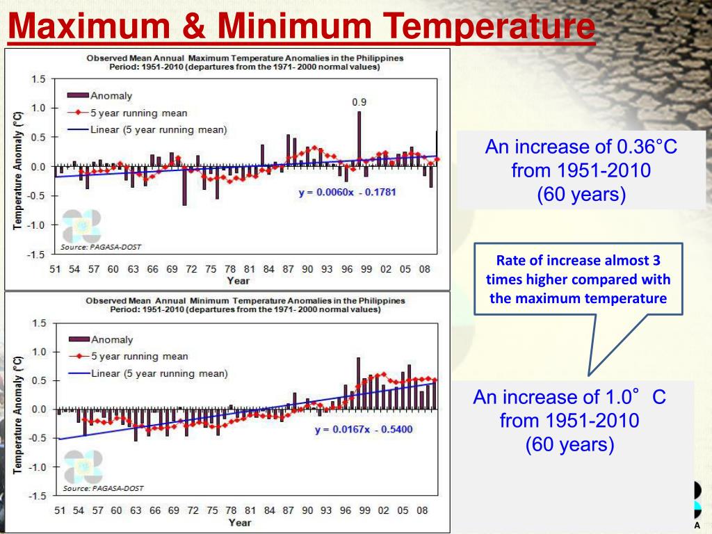Philippines mean temperature Observed Mean Temperature Anomalies in the Philippines (1951-2010) Departures from 1971-2000 normal values An increase of 0.65°C from 1951-2010 (60 years)