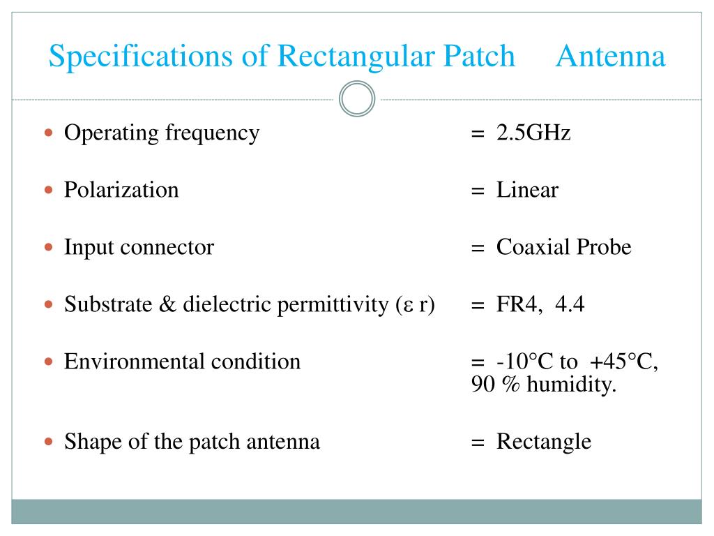 Specifications of Rectangular Patch Antenna • Operating frequency = 2.5GHz • Polarization = Linear • Input connector = Coaxial Probe • Substrate & dielectric permittivity ( r) = FR4, 4.4 • Environmental condition = -10C to +45C, 90 % humidity. • Shape of the patch antenna = Rectangle