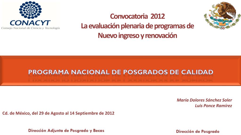 Convocatoria 2012 La evaluación plenaria de programas de Nuevo ingreso y renovación. PROGRAMA NACIONAL DE POSGRADOS DE CALIDAD. María Dolores Sánchez Soler. María Dolores Sánchez Soler Luis Ponce Ramírez. Cd. de México, del 29 de Agosto al 14 Septiembre de 2012.