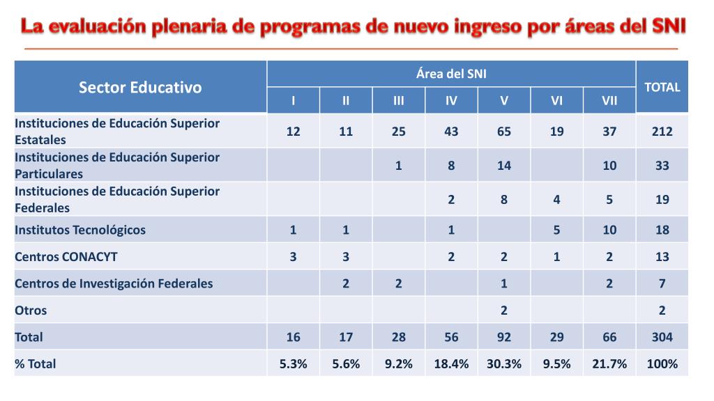 La evaluación plenaria de programas de nuevo ingreso por áreas del SNI