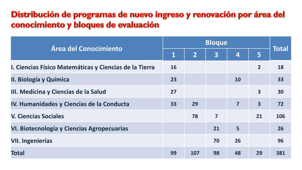 Distribución de programas de nuevo ingreso y renovación por área del conocimiento y bloques de evaluación