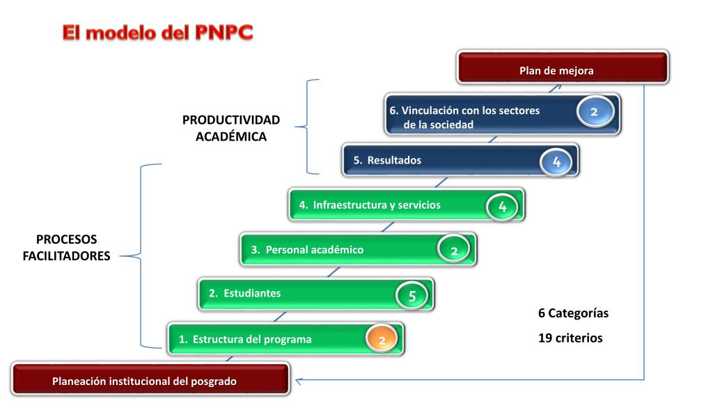 El modelo del PNPC Plan de mejora 2 6. Vinculación con los sectores de la sociedad PRODUCTIVIDAD ACADÉMICA 4 • Resultados 4 • Infraestructura y servicios PROCESOS FACILITADORES 2 3. Personal académico 5 2. Estudiantes 6 Categorías 19 criterios 2 • Estructura del programa Planeación institucional del posgrado