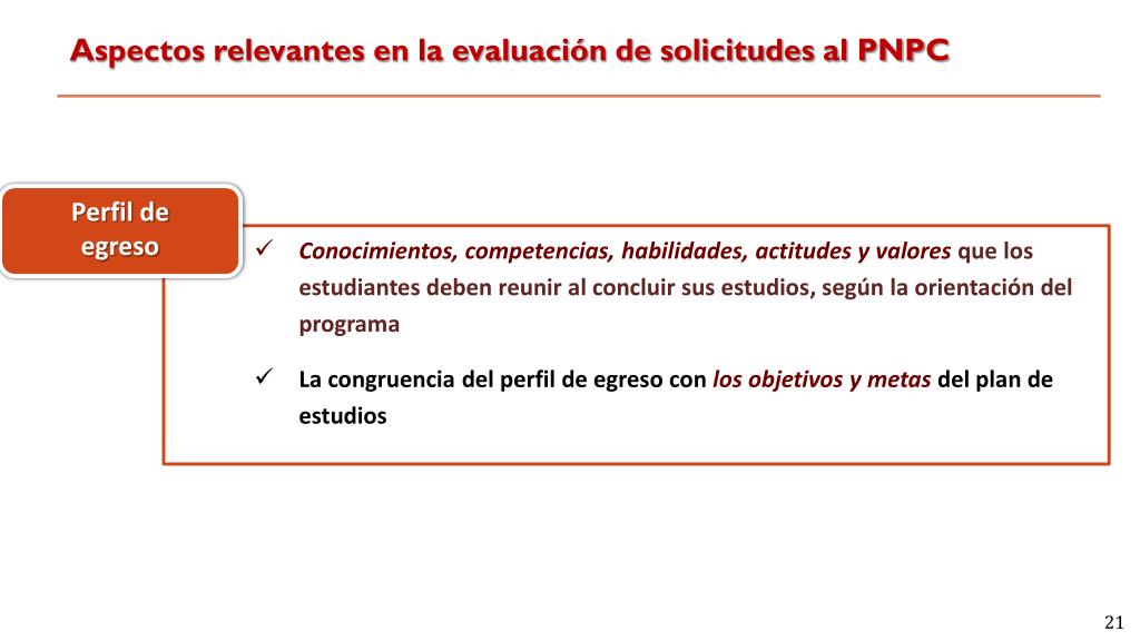 Aspectos relevantes en la evaluación de solicitudes al PNPC Perfil de egreso • Conocimientos, competencias, habilidades, actitudes y valores que los estudiantes deben reunir al concluir sus estudios, según la orientación del programa • La congruencia del perfil de egreso con los objetivos y metas del plan de estudios