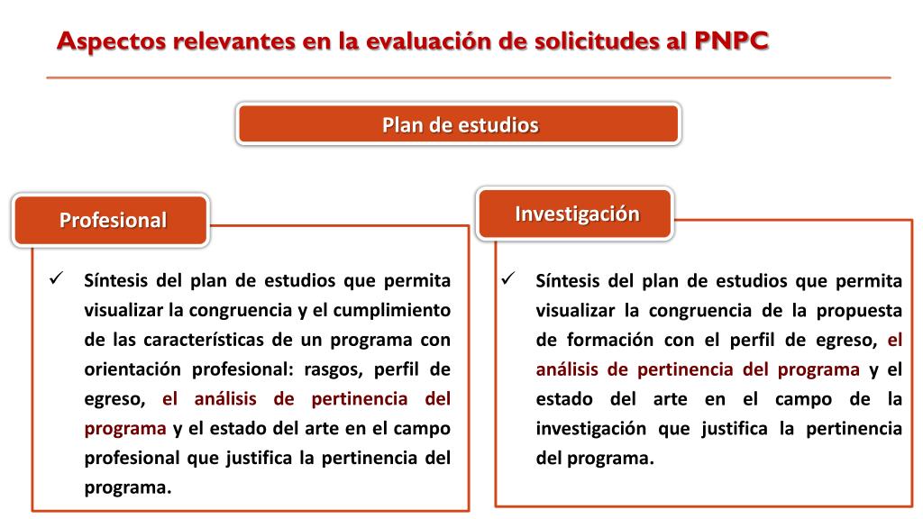 Aspectos relevantes en la evaluación de solicitudes al PNPC Plan de estudios Investigación Profesional • Síntesis del plan de estudios que permita visualizar la congruencia y el cumplimiento de las características de un programa con orientación profesional: rasgos, perfil de egreso, el análisis de pertinencia del programa y el estado del arte en el campo profesional que justifica la pertinencia del programa. • Síntesis del plan de estudios que permita visualizar la congruencia de la propuesta de formación con el perfil de egreso, el análisis de pertinencia del programa y el estado del arte en el campo de la investigación que justifica la pertinencia del programa.