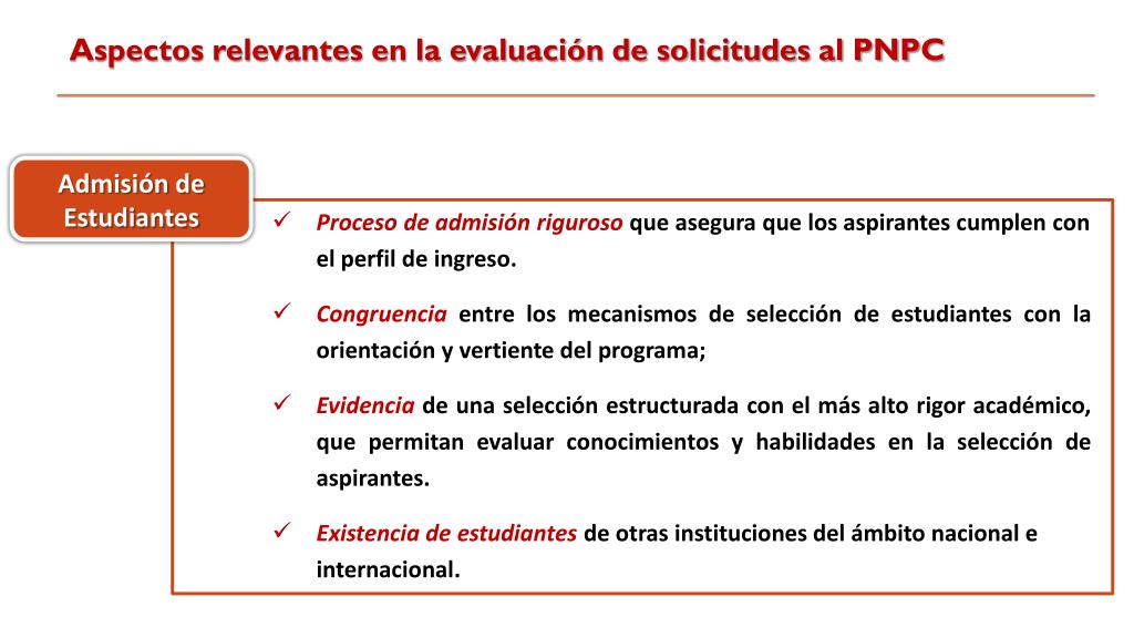 Aspectos relevantes en la evaluación de solicitudes al PNPC Admisión de Estudiantes • Proceso de admisión riguroso que asegura que los aspirantes cumplen con el perfil de ingreso. • Congruenciaentre los mecanismos de selección de estudiantes con la orientación y vertiente del programa; • Evidenciade una selección estructurada con el más alto rigor académico, que permitan evaluar conocimientos y habilidades en la selección de aspirantes. • Existencia de estudiantes de otras instituciones del ámbito nacional e internacional.