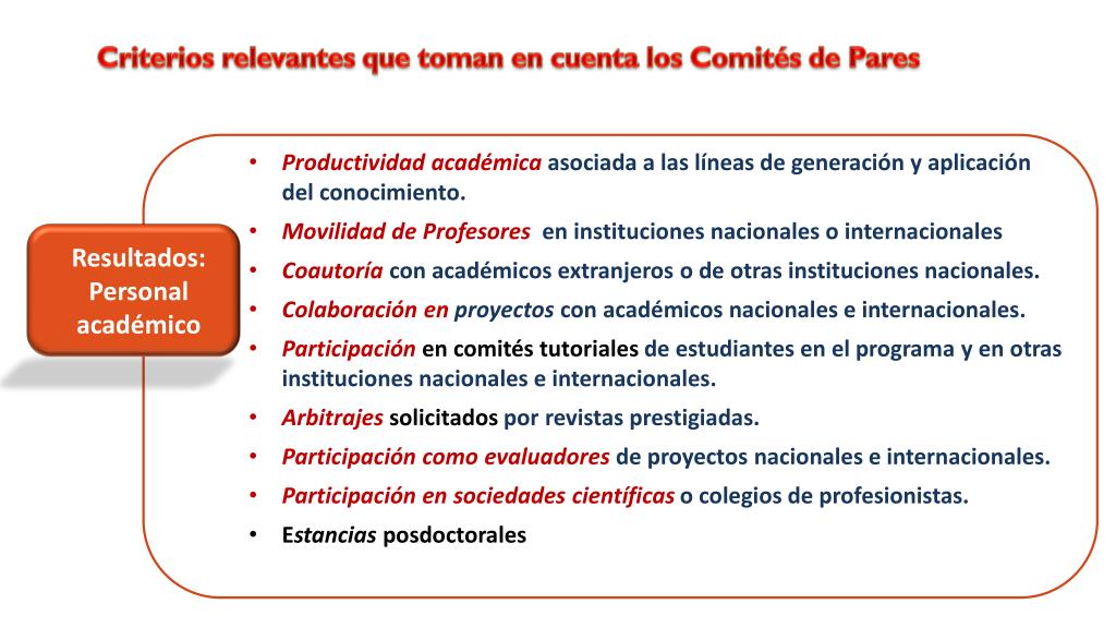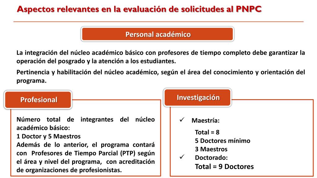 Aspectos relevantes en la evaluación de solicitudes al PNPC Personal académico La integración del núcleo académico básico con profesores de tiempo completo debe garantizar la operación del posgrado y la atención a los estudiantes. Pertinencia y habilitación del núcleo académico, según el área del conocimiento y orientación del programa. Investigación Profesional Número total de integrantes del núcleo académico básico: 1 Doctor y 5 Maestros Además de lo anterior, el programa contará con Profesores de Tiempo Parcial (PTP) según el área y nivel del programa, con acreditación de organizaciones de profesionistas. • Maestría: • Total = 8 • 5 Doctores mínimo • 3 Maestros • Doctorado: • Total = 9 Doctores