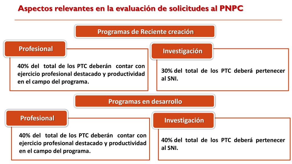 Aspectos relevantes en la evaluación de solicitudes al PNPC Programas de Reciente creación Profesional Investigación 40% del total de los PTC deberán contar con ejercicio profesional destacado y productividad en el campo del programa. 30% del total de los PTC deberá pertenecer al SNI. Programas en desarrollo Profesional Investigación 40% del total de los PTC deberán contar con ejercicio profesional destacado y productividad en el campo del programa. 40% del total de los PTC deberá pertenecer al SNI.