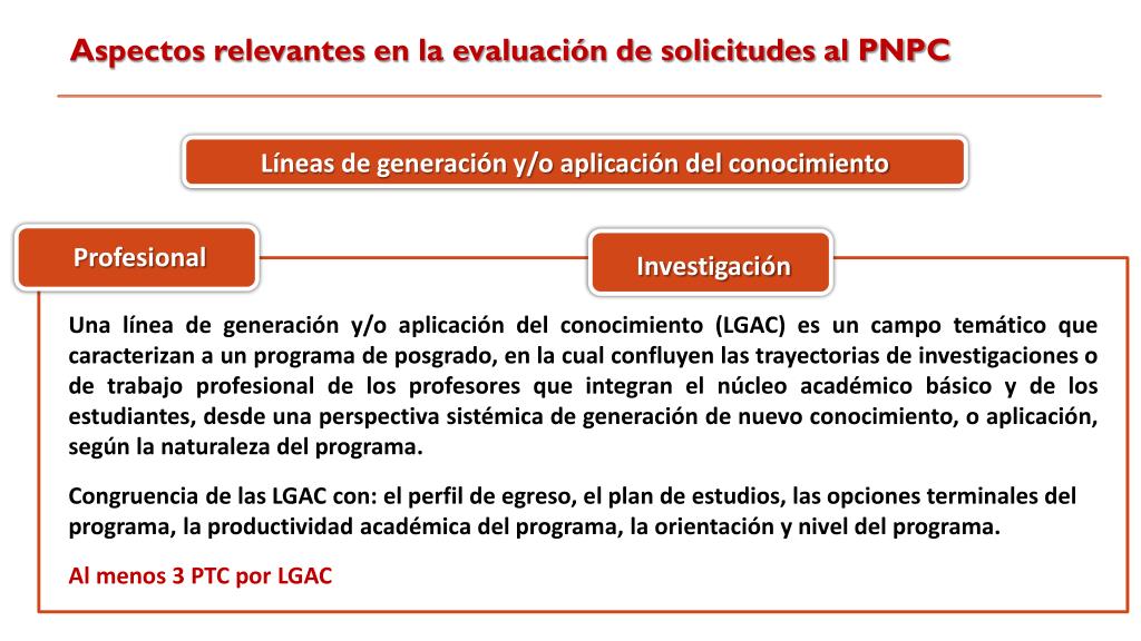 Aspectos relevantes en la evaluación de solicitudes al PNPC Líneas de generación y/o aplicación del conocimiento Profesional Investigación Una línea de generación y/o aplicación del conocimiento (LGAC) es un campo temático que caracterizan a un programa de posgrado, en la cual confluyen las trayectorias de investigaciones o de trabajo profesional de los profesores que integran el núcleo académico básico y de los estudiantes, desde una perspectiva sistémica de generación de nuevo conocimiento, o aplicación, según la naturaleza del programa. Congruencia de las LGAC con: el perfil de egreso, el plan de estudios, las opciones terminales del programa, la productividad académica del programa, la orientación y nivel del programa. Al menos 3 PTC por LGAC