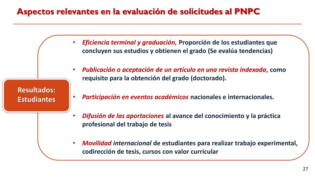 Aspectos relevantes en la evaluación de solicitudes al PNPC • Eficiencia terminal y graduación, Proporción de los estudiantes que concluyen sus estudios y obtienen el grado (Se evalúa tendencias) • Publicación o aceptación de un artículo en una revista indexada, como requisito para la obtención del grado (doctorado). • Participación en eventos académicosnacionales e internacionales. • Difusión de las aportaciones al avance del conocimiento y la práctica profesional del trabajo de tesis • Movilidadinternacional de estudiantes para realizar trabajo experimental, codirección de tesis, cursos con valor curricular Resultados: Estudiantes