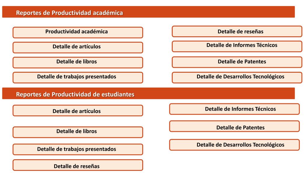 Reportes de Productividad académica Productividad académica Detalle de reseñas Detalle de Informes Técnicos Detalle de artículos Detalle de libros Detalle de Patentes Detalle de trabajos presentados Detalle de Desarrollos Tecnológicos Reportes de Productividad de estudiantes Detalle de Informes Técnicos Detalle de artículos Detalle de Patentes Detalle de libros Detalle de Desarrollos Tecnológicos Detalle de trabajos presentados Detalle de reseñas