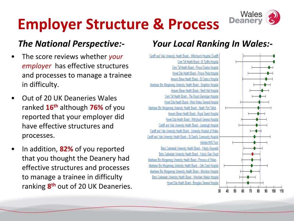Employer Structure & Process The National Perspective:- Your Local Ranking In Wales:- • The score reviews whether your employer has effective structures and processes to manage a trainee in difficulty. • Out of 20 UK Deaneries Wales ranked 16thalthough 76% of you reported that your employer did have effective structures and processes. • In addition, 82% of you reported that you thought the Deanery had effective structures and processes to manage a trainee in difficulty ranking 8thout of 20 UK Deaneries.