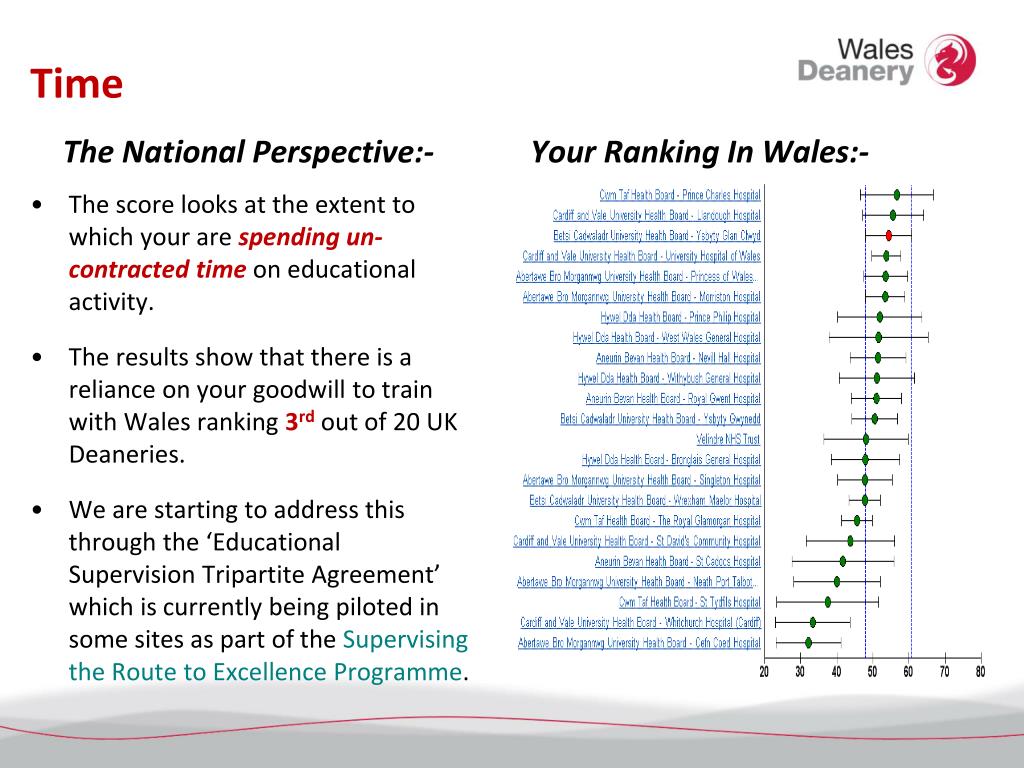Time The National Perspective:- Your Ranking In Wales:- • The score looks at the extent to which your are spending un-contracted timeon educational activity. • The results show that there is a reliance on your goodwill to train with Wales ranking 3rdout of 20 UK Deaneries. • We are starting to address this through the ‘Educational Supervision Tripartite Agreement’ which is currently being piloted in some sites as part of the Supervising the Route to Excellence Programme.