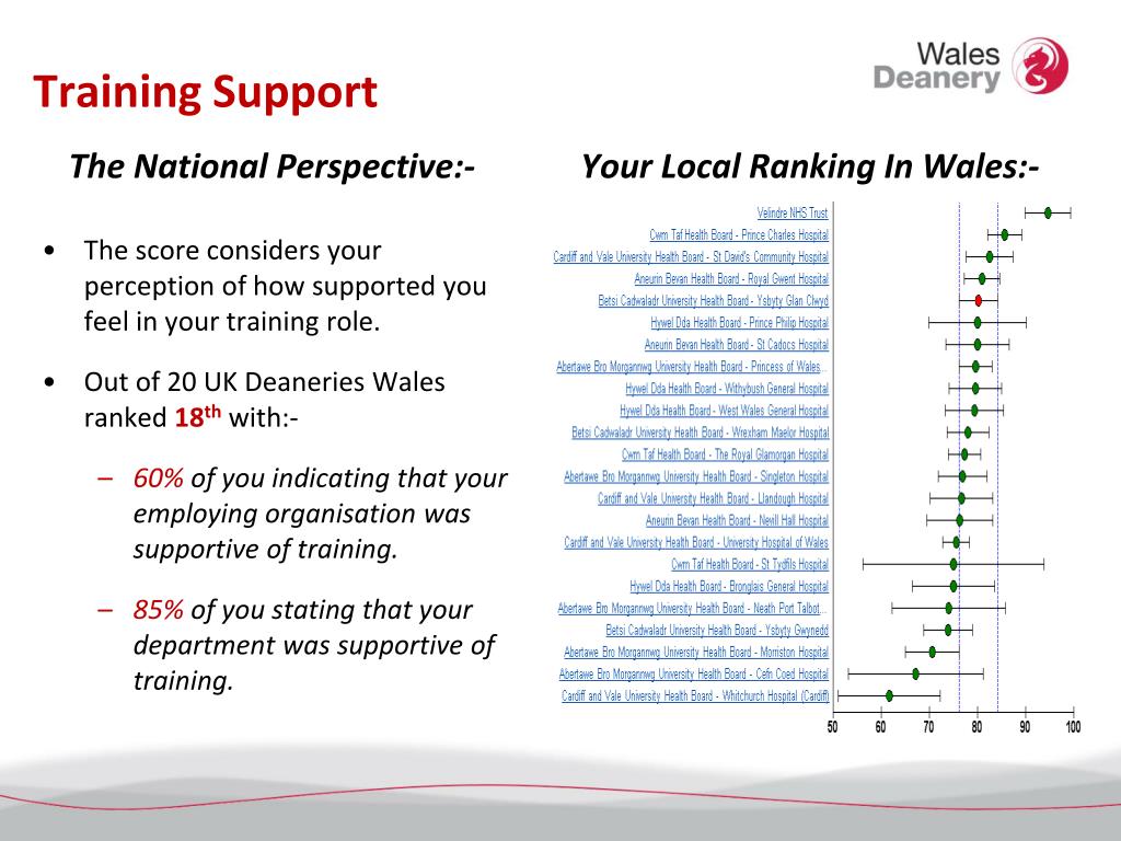 Training Support The National Perspective:- Your Local Ranking In Wales:- • The score considers your perception of how supported you feel in your training role. • Out of 20 UK Deaneries Wales ranked 18thwith:- • 60% of you indicating that your employing organisation was supportive of training. • 85% of you stating that your department was supportive of training.