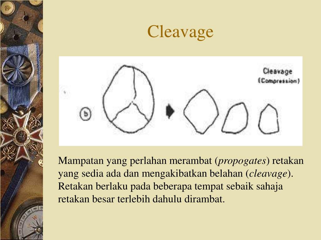 Cleavage Mampatan yang perlahan merambat (propogates) retakan yang sedia ada dan mengakibatkan belahan (cleavage). Retakan berlaku pada beberapa tempat sebaik sahaja retakan besar terlebih dahulu dirambat.