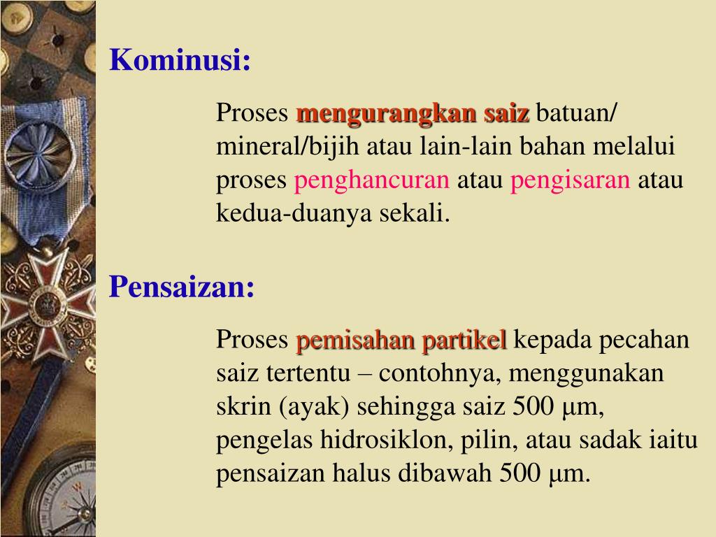 Kominusi: • Proses mengurangkan saiz batuan/ mineral/bijih atau lain-lain bahan melalui proses penghancuran atau pengisaran atau kedua-duanya sekali. • Pensaizan: • Proses pemisahan partikel kepada pecahan saiz tertentu – contohnya, menggunakan skrin (ayak) sehingga saiz 500 μm, pengelas hidrosiklon, pilin, atau sadak iaitu pensaizan halus dibawah 500 μm.