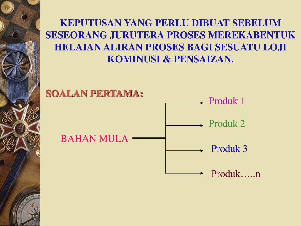 KEPUTUSAN YANG PERLU DIBUAT SEBELUM SESEORANG JURUTERA PROSES MEREKABENTUK HELAIAN ALIRAN PROSES BAGI SESUATU LOJI KOMINUSI & PENSAIZAN. SOALAN PERTAMA: Produk 1 Produk 2 BAHAN MULA Produk 3 Produk…..n